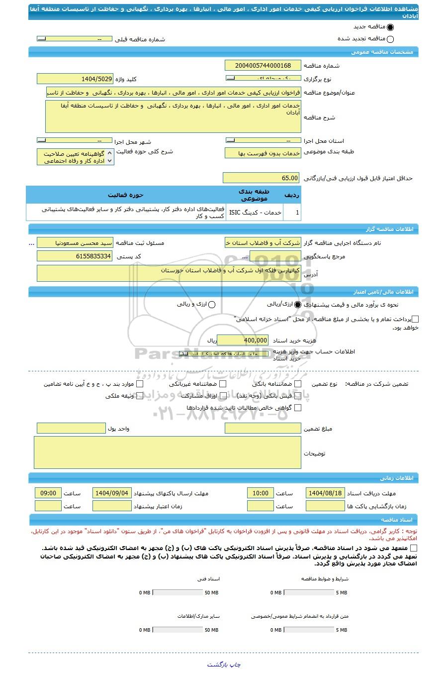 مناقصه فراخوان ارزیابی کیفی خدمات امور اداری امور مالی انبارها بهره برداری نگهبانی و حفاظت از تاسیسات منطقه آبفا آبادان