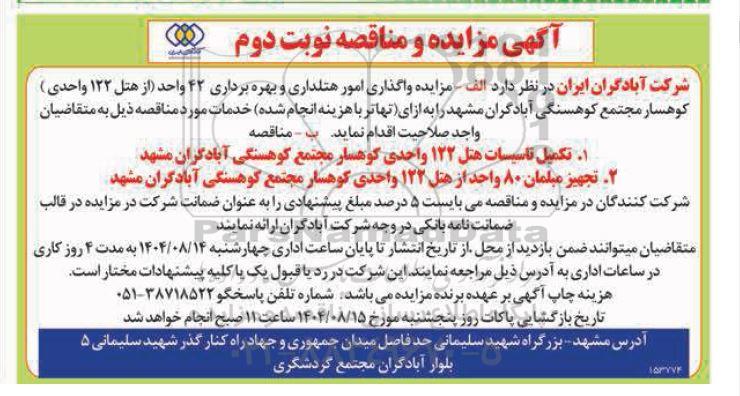 | عنوان آگهی: مناقصه و مزایده تکمیل تاسیسات هتل 122 واحدی ... / نوبت دوم |