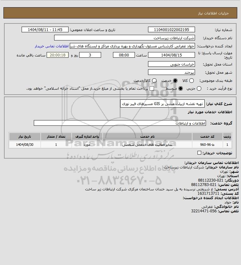 تلفن:5- 88349670 (021) فکس: 88349673 (021) Website: www.ParsNamadData.com E-mail: Info@ParsNamadData.com استعلام تهیه نقشه ازبیلت مبتنی بر GIS مسیرهای فیبر نوری