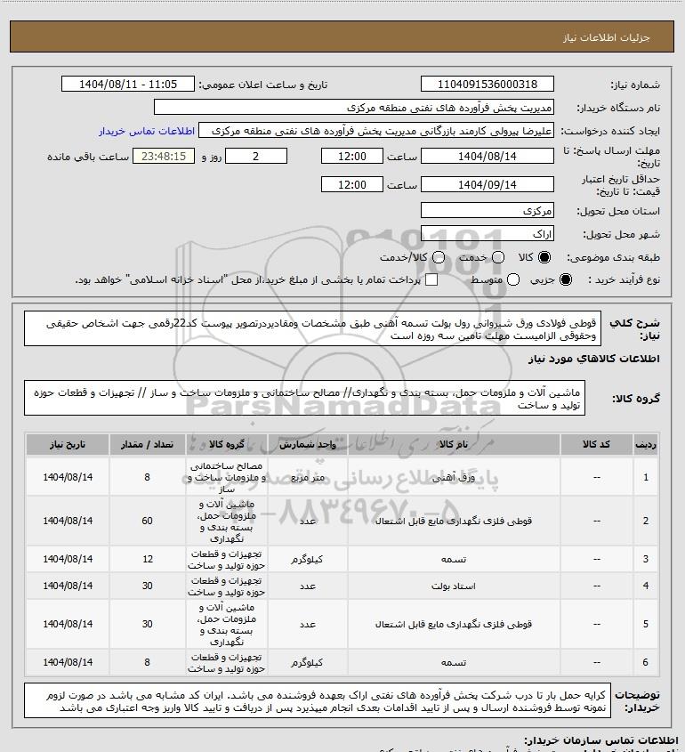 تلفن:5- 88349670 (021) فکس: 88349673 (021) Website: www.ParsNamadData.com E-mail: Info@ParsNamadData.com استعلام قوطی فولادی ورق شیروانی رول بولت تسمه آهنی طبق مشخصات ومقادیردرتصویر پیوست