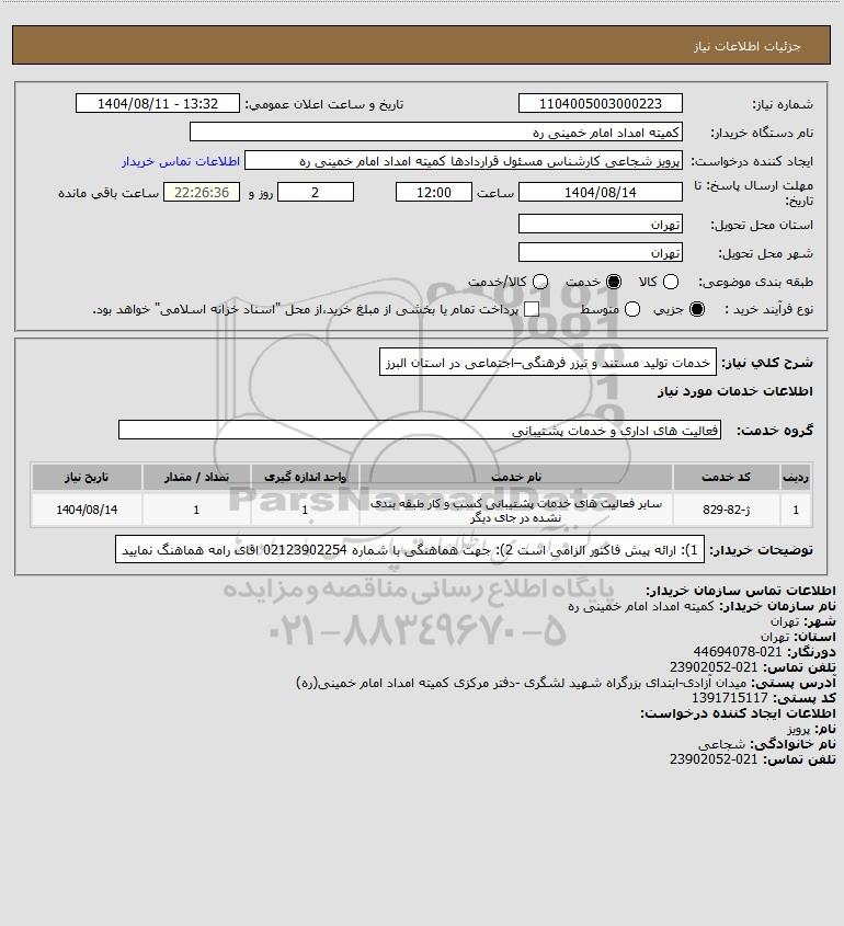 تلفن:5- 88349670 (021) فکس: 88349673 (021) Website: www.ParsNamadData.com E-mail: Info@ParsNamadData.com استعلام خدمات تولید مستند و تیزر فرهنگی–اجتماعی در استان البرز