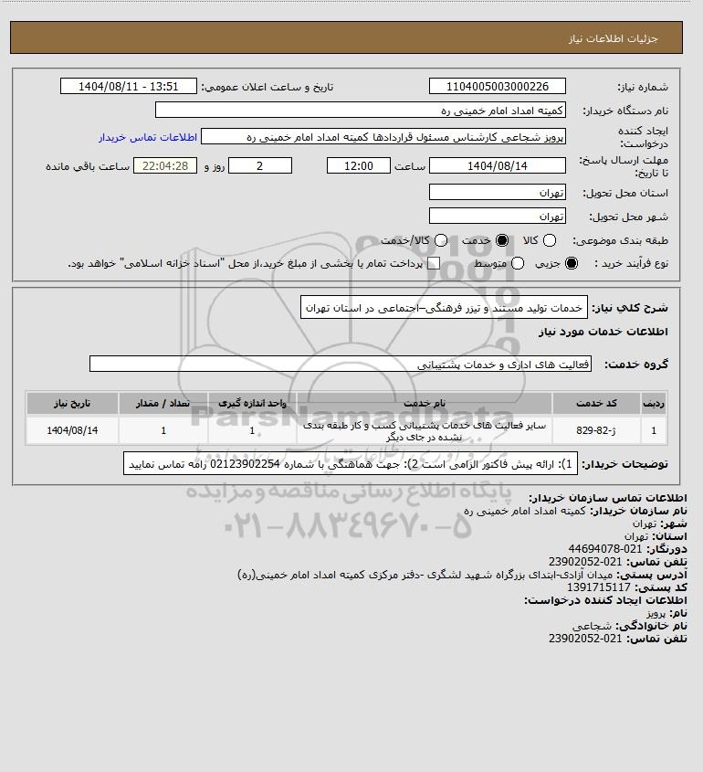 تلفن:5- 88349670 (021) فکس: 88349673 (021) Website: www.ParsNamadData.com E-mail: Info@ParsNamadData.com استعلام خدمات تولید مستند و تیزر فرهنگی–اجتماعی در استان تهران