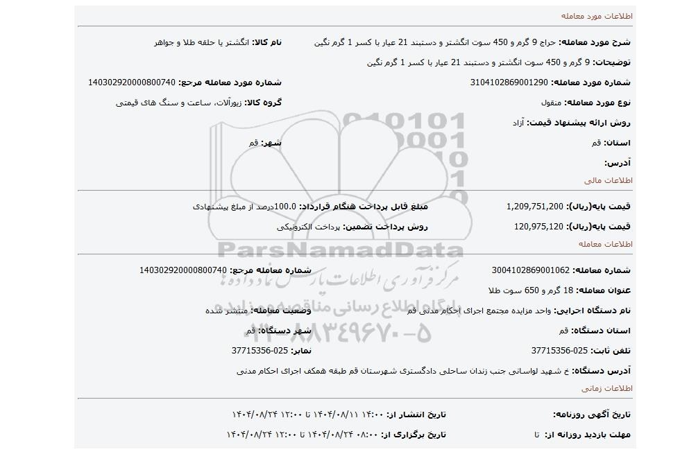| عنوان آگهی: مزایده 9 گرم و 450 سوت انگشتر و دستبند 21 عیار با کسر 1 گرم نگین |