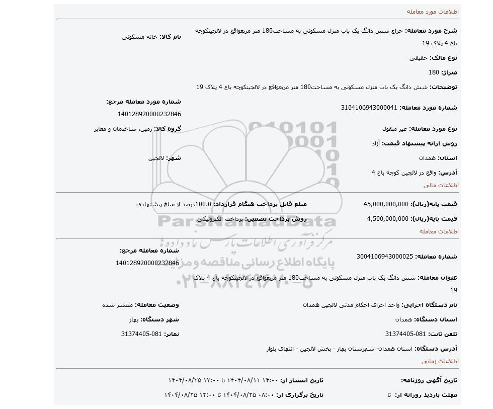 | شرح مورد معامله: حراج شش دانگ یک باب منزل مسکونی به مساحت180 متر مربعواقع در لالجینکوچه باغ 4 پلاک 19 | | نام کالا: خانه مسکونی | | نوع مالک: حقیقی | | متراژ: 180 | | توضیحات: شش دانگ یک باب منزل مسکونی به مساحت180 متر مربعواقع در لالجینکوچه باغ 4 پلاک 19 | | شماره مورد معامله: 3104106943000041 | | شماره مورد معامله مرجع: 140128920000232846 | | نوع مورد معامله: غیر منقول | | گروه کالا: زمین، ساختمان و معابر | | روش ارائه پیشنهاد قیمت: آزاد
