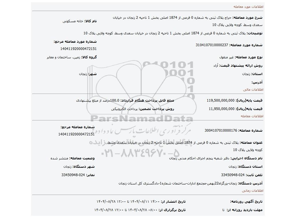 | عنوان آگهی: مزایده پلاک ثبتی به شماره 0 فرعی از 1874 اصلی بخش 1 ناحیه 2 زنجان در خیابان سعدی وسط کوچه ولایی پلاک 10 |