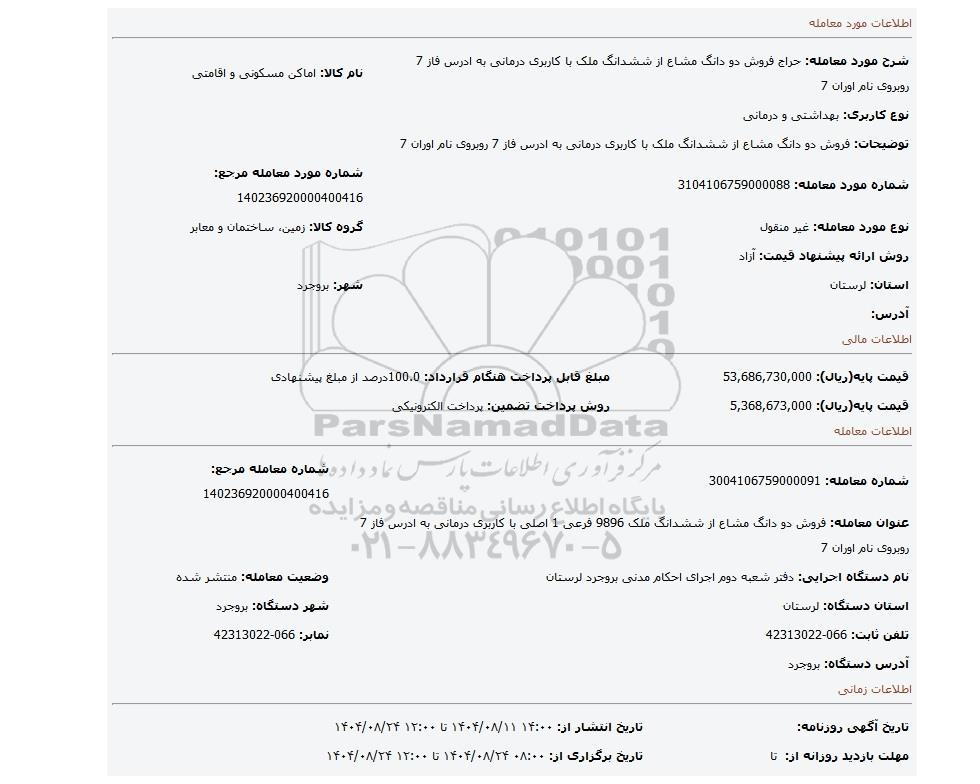 مزایده فروش دو دانگ مشاع از ششدانگ ملک با کاربری درمانی به ادرس فاز 7 روبروی نام اوران 7