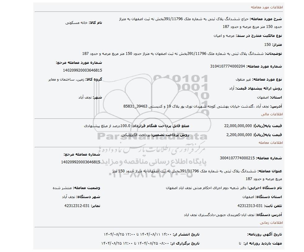 | عنوان آگهی: مزایده ششدانگ پلاک ثبتی به شماره ملک 391/11796بخش نه ثبت اصفهان به متراژ حدود 150 متر مربع عرصه و حدود 187 |