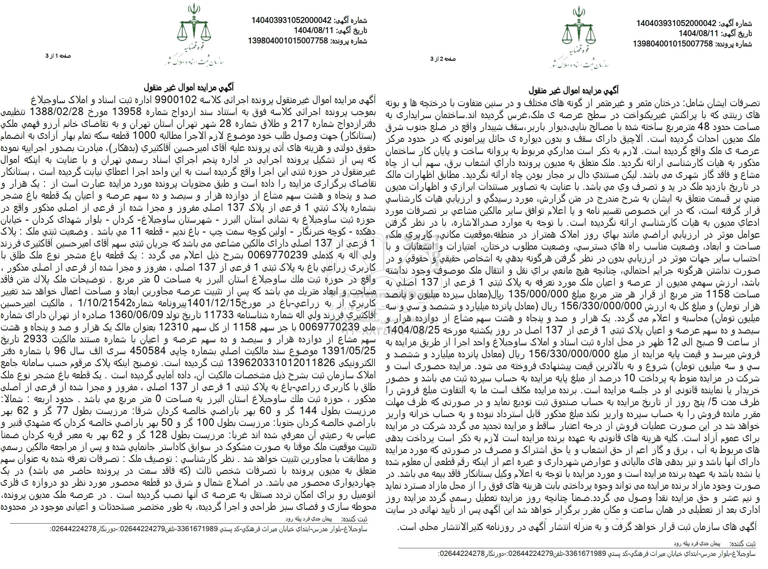 | عنوان آگهی: مزایده یک هزار و صد و پنجاه و هشت سهم مشاع از دوازده هزار و سیصد و ده سهم عرصه و اعیان یک قطعه باغ مشجر |
