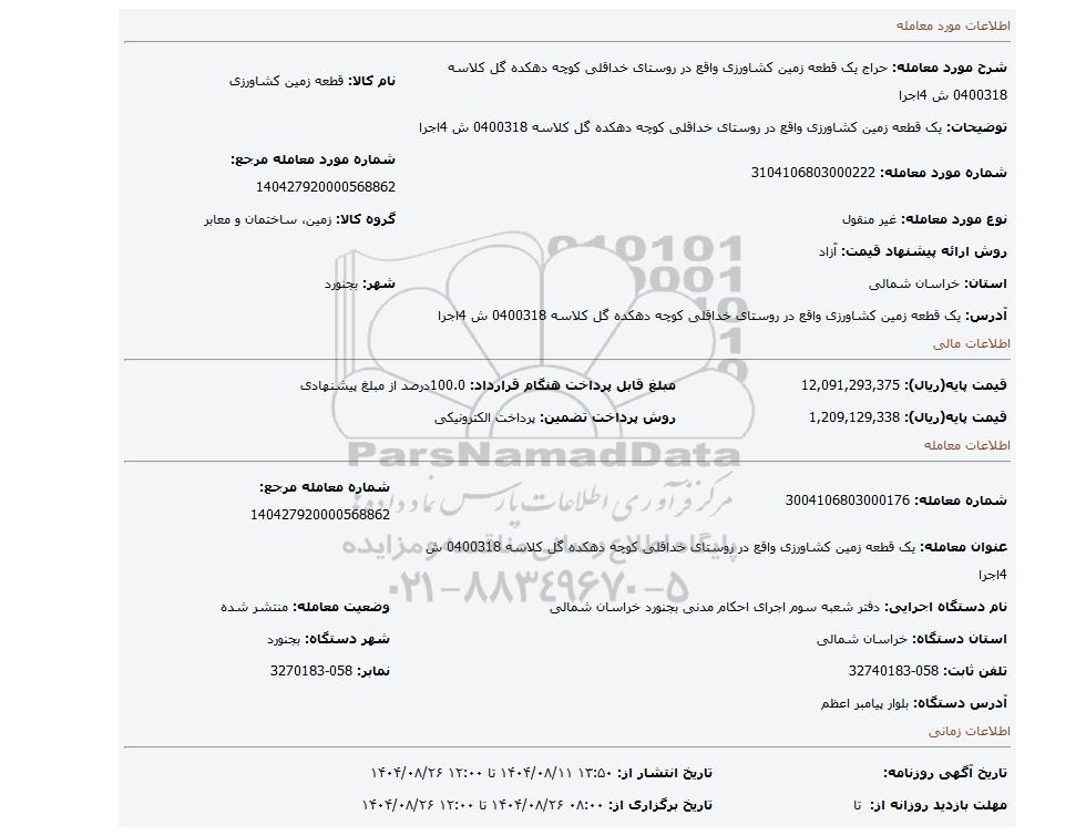 | عنوان آگهی: مزایده یک قطعه زمین کشاورزی واقع در روستای خداقلی کوچه دهکده گل کلاسه 0400318 ش 4اجرا |