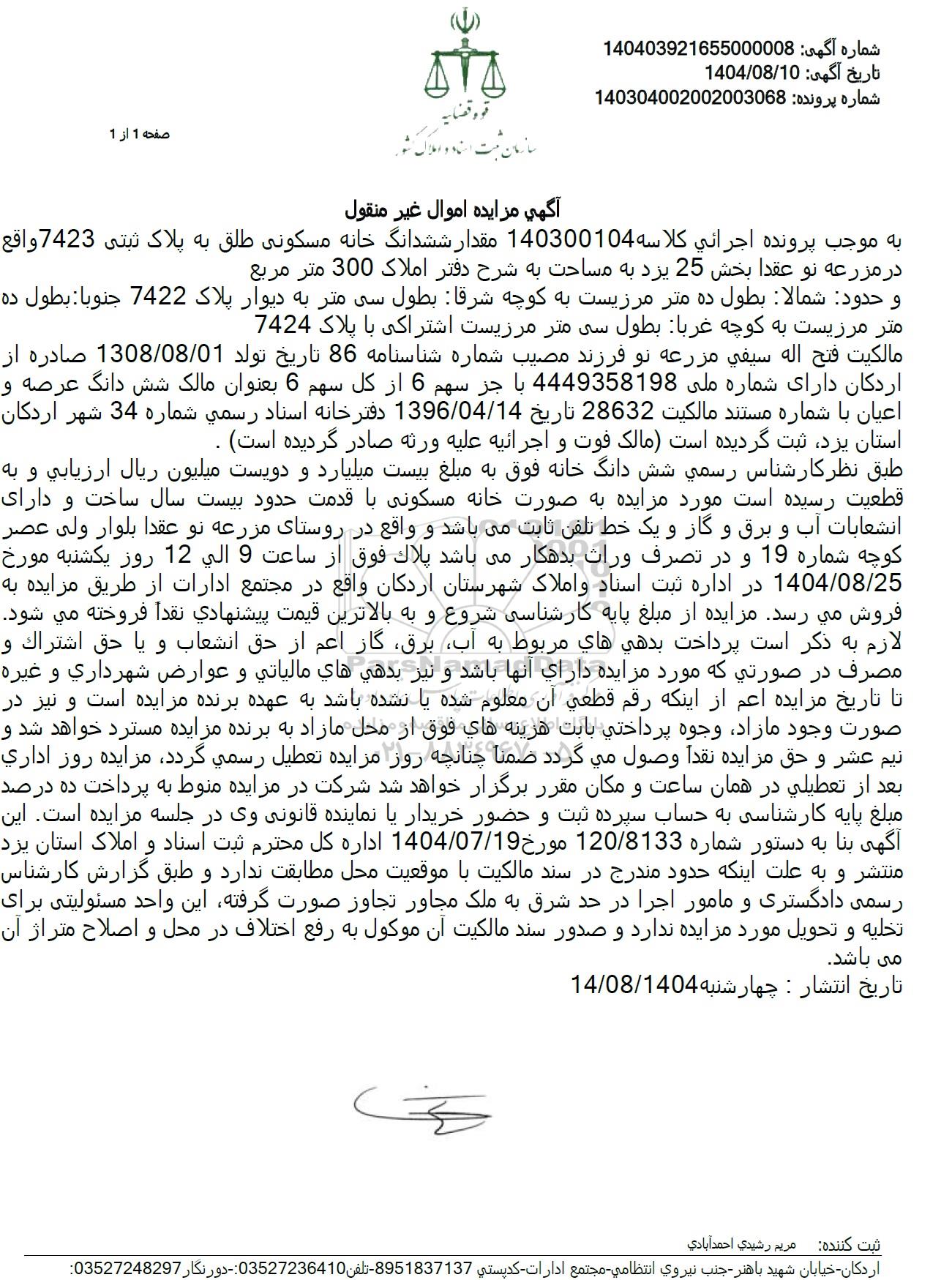 به موجب پرونده اجرائی كلاسه 140300104 مقدار ششدانگ خانه مسکونی طلق به پلاک ثبتی 7423 واقع در مزرعه نو عقدا بخش 25 یزد به مساحت به شرح دفتر املاک 300 متر مربع