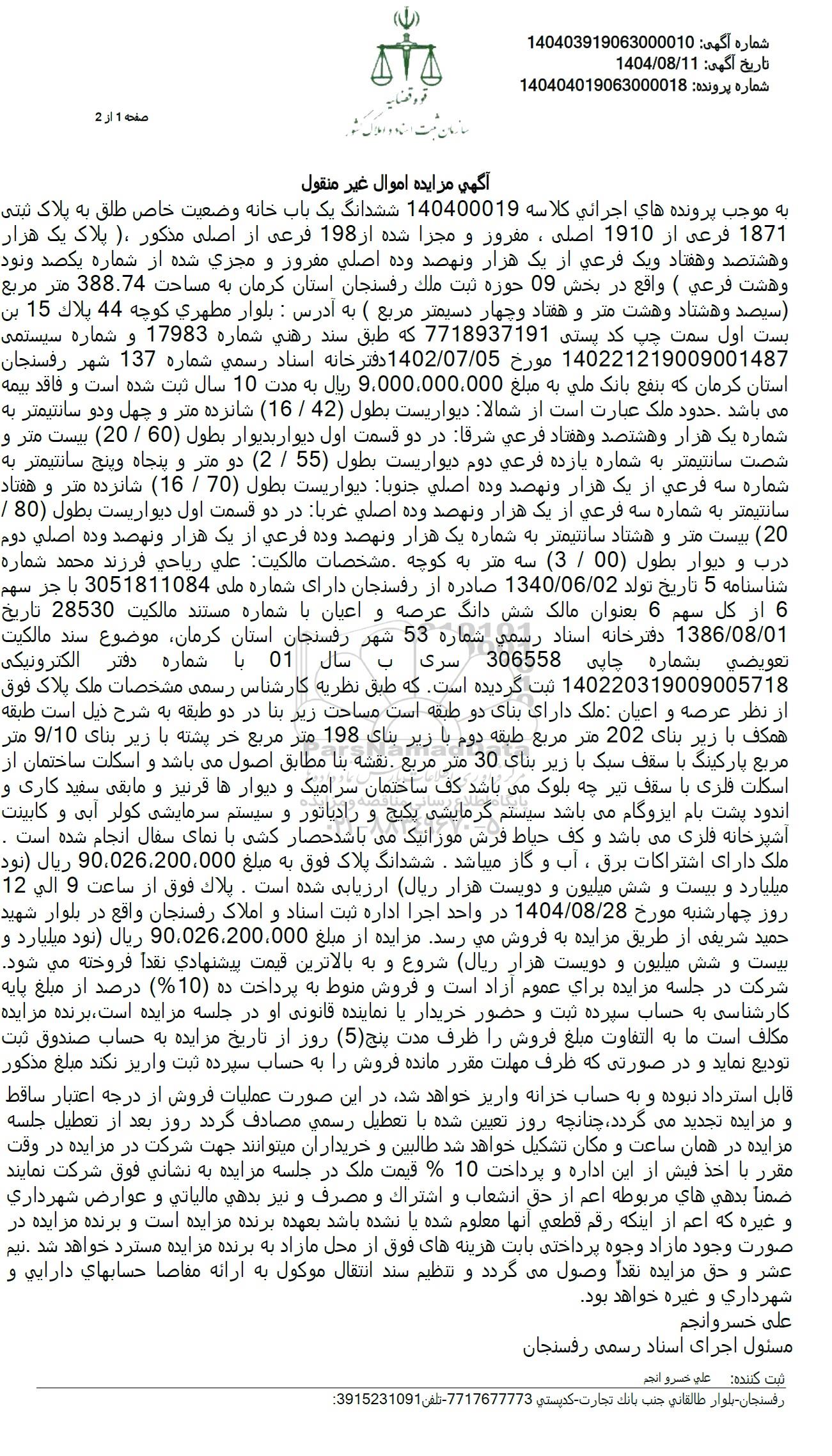 به موجب پرونده های اجرائی کلاسه 140400019 ششدانگ یک باب خانه وضعیت خاص طلق به پلاک ثبتی 1871 فرعی از 1910 اصلی ، مفروز و مجرا شده از 198 فرعی از اصلی مذکور ، (پلاک یک هزار و هشتصد و هفتاد و یک فرعی از یک هزار و نهصد وده اصلی مفرور و مجری شده از شماره یکصد و نود و هشت فرعی) واقع در بخش 09 حوزه ثبت ملک رفسنجان استان کرمان به مساحت 388.74 متر مربع سیصد و هشتاد و هشت متر و هفتاد و چهار دسیمتر مربع ( به آدرس : بلوار مطهری کوچه 44 پلاک 15 بن بست اول سمت چپ کد پستی 7718937191 که طبق سند رهنی شماره 17983 و شماره سیستمی 140221219009001487 مورخ 1402/07/05 دفتر خانه اسناد رسمی شماره 137 شهر رفسنجان لیا استان کرمان که بنفع بانک ملی به مبلغ 9.000.000.000 ریال به مدت 10 سال ثبت شده است و فاقد بیمه می باشد حدود ملک عبارت است از از شمالا دیواریست بطول (42) / (16) شانزده متر و چهل و دو سانتیمتر به شماره یک هزار و هشتصد و هفتاد فرعی شرقا در دو قسمت اول دیوار بدیوار بطول 60 / 20) بیست متر و شصت سانتیمتر به شماره یازده فرعی دوم دیواریست بطول (55) / (2) دو متر و پنجاه وپنج سانتیمتر به شماره سه فرعی از یک هزار و نهصد و ده اصلی جنوبا دیواریست بطول (70) / (16) شانزده متر و هفتاد سانتیمتر به شماره سه فرعی از یک هزار و نهصد وده اصلی غربا در دو قسمت اول دیواریست بطول (80) /(20) بیست متر و هشتاد سانتیمتر به شماره یک هزار و نهصد و ده فرعی از یک هزار و نهصد وده اصلی دوم درب و دیوار بطول (00 / (3) سه متر به کوچه مشخصات مالکیت علی ریاحی فرزند محمد شماره شناسنامه 5 تاریخ تولد 1340/06/02 صادره از رفسنجان دارای شماره ملی 3051811084 با جر سهم 6 از کل سهم 6 بعنوان مالک شش دانگ عرصه و اعیان با شماره مستند مالکیت 28530 تاریخ 1386/08/01 دفترخانه اسناد رسمی شماره 53 شهر رفسنجان استان کرمان موضوع سند مالکیت تعویضی بشماره چاپی 306558 سری سال 01 با شماره دفتر الکترونیکی 140220319009005718 ثبت گردیده است که طبق نظریه کارشناس رسمی مشخصات ملک پلاک فوق از نظر عرصه و اعیان ملک دارای بنای دو طبقه است مساحت زیر بنا در دو طبقه به شرح ذیل است طبقه همکف با زیر بنای 202 متر مربع طبقه دوم با زیر بنای 198 متر مربع خرپشته با زیر بنای 9/10 متر مربع پارکینگ با سقف سبک با زیر بنای 30 متر مربع نقشه بنا مطابق اصول میباشد و اسکلت ساختمان از اسکلت فلزی با سقف تیر چه بلوک میباشد کف ساختمان سرامیک و دیوارها قرنیز و مابقی سفید کاری و اندود پشت بام ایزوگام میباشد سیستم گرمایشی پکیج و رادیاتور و سیستم سرمایشی کولر آبی و کابینت اشپزخانه فلزی میباشد و کف حیاط فرش موزائیک میباشد حصار کشی با نمای سفال انجام شده است . ملک دارای اشتراکات برق، آب و گاز میباشد. ششدانگ پلاک فوق به مبلغ 90.026.200.000 ریال (نود میلیارد و بیست و شش میلیون و دویست هزار ریال ) ارزیابی شده است. پلاک فوق از ساعت 9 الی 12 روز چهارشنبه مورخ 1404.08.28 در واحد اجرا اداره ثبت اسناد و املاک رفسنجان واقع در بلوار شهید حمید شریفی از طریق مزایده به فروش میرسد. مزایده از مبلغ 90.026.200.000 ریال نود (میلیارد و بیست و شش میلیون و دویست هزار ریال) شروع و به بالاترین قیمت پیشنهادی نقدا فروخته می شود. شرکت در جلسه مزایده برای عموم آزاد است و فروش منوط به پرداخت ده (10%) درصد از مبلغ پایه کارشناسی به حساب سپرده ثبت و حضور خریدار یا نماینده قانونی او در جلسه مزایده است، برنده مزایده مکلف است ما به التفاوت مبلغ فروش را ظرف مدت پنج (5) روز از تاریخ مزایده به حساب صندوق ثبت تودیع نماید و در صورتی که ظرف مهلت مقرر مانده فروش را به حساب سپرده ثبت واریز نکند مبلغ مذکور قابل استرداد نبوده و به حساب خزانه واریز خواهد شد در این صورت عملیات فروش از درجه اعتبار ساقط و مزایده تجدید می گردد چنانچه روز تعیین شده با تعطیل رسمی مصادف گردد روز بعد از تعطیل جلسه مزایده در همان ساعت و مکان تشکیل خواهد شد طالبین و خریداران میتوانند جهت شرکت در مزایده در وقت مقرر با اخذ فیش از این اداره و پرداخت 10% قیمت ملک در جلسه مزایده به نشانی فوق شرکت نمایند ضمنا بدهی های مربوطه اعم از حق 