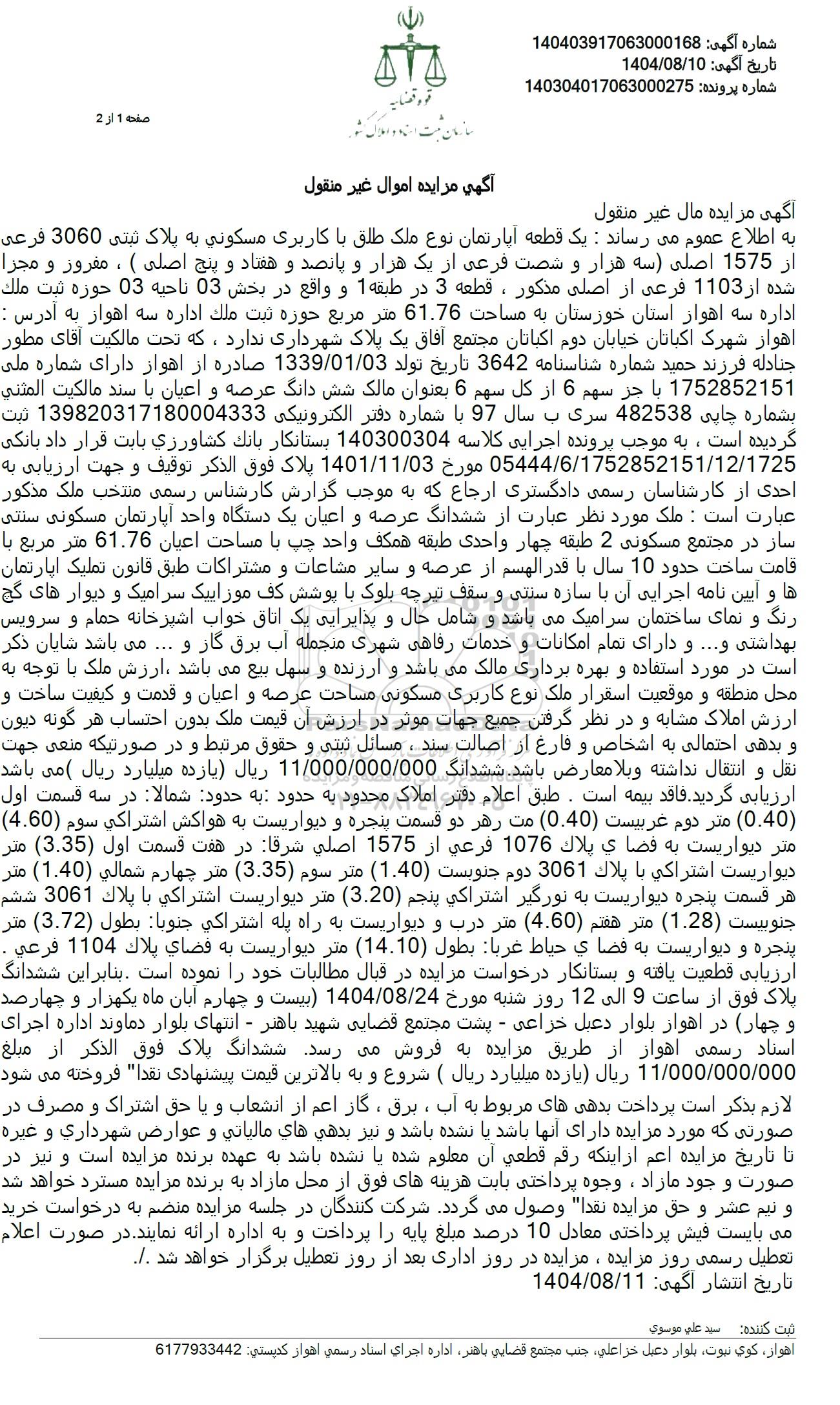 . به اطلاع عموم می رساند: یک قطعه آپارتمان نوع ملک طلق با کاربری مسکونی به پلاک ثبتی 3060 فرعی از 1575 اصلی سه هزار و شصت فرعی از یک هزار و پانصد و هفتاد و پنج اصلی ، مفروز و مجرا شده از 1103 فرعی از اصلی مذکور، قطعه 3 در طبقه 1 و واقع در بخش 03 ناحیه 03 حوزه ثبت ملک اداره سه اهواز استان خوزستان به مساحت 61.76 متر مربع حوزه ثبت ملک اداره سه اهواز به آدرس : اهواز شهرک اکباتان خیابان دوم اکباتان مجتمع افاق یک پلاک شهرداری ندارد، که تحت مالکیت آقای مطور جنادله فرزند حمید شماره شناسنامه 3642 تاریخ تولد 1339.01.03 صادره از اهواز دارای شماره ملی 1752852151 با جز سهم 6 از کل سهم 6 بعنوان سهم 6 بعنوان مالک شش دانگ عرصه و اعیان با سند مالکیت المثنی بشماره چاپی 482538 سری ب سال 97 با شماره دفتر الکترونیکی 139820317180004333 ثبت گردیده است، به موجب پرونده اجرایی کلاسه 140300304 بستانکار بانک کشاورزی بابت قرار داد بانکی 05444.6.1752852151.12.1725 مورخ 1401.11.03 پلاک فوق الذکر توقیف و جهت ارزیابی به احدی از کارشناسان رسمی دادگستری ارجاع که به موجب گزارش کارشناس رسمی منتخب ملک مذکور عبارت است : ملک مورد نظر عبارت از ششدانگ عرصه و اعیان یک دستگاه واحد آپارتمان مسکونی سنتی ساز در مجتمع مسکونی 2 طبقه چهار واحدی طبقه همکف واحد چپ با مساحت اعیان 61.76 متر مربع با قامت ساخت حدود 10 سال با قدر الهسم از عرصه و سایر مشاعات و مشتراکات طبق قانون تملیک آپارتمان ها و آیین نامه اجرایی آن با سازه سنتی و سقف تیرچه بلوک با پوشش کف موزاییک سرامیک و دیوارهای گچ رنگ و نمای ساختمان سرامیک میباشد و شامل حال و پذایرایی یک اتاق خواب اشپزخانه حمام و سرویس بهداشتی و.... و دارای تمام امکانات و خدمات رفاهی شهری منجمله آب برق گاز و .... می باشد شایان ذکر است در مورد استفاده و بهره برداری مالک میباشد و ارزنده و سهل بیع میباشد ارزش ملک با توجه به محل منطقه و موقعیت اسقرار ملک نوع کاربری مسکونی مساحت عرصه و اعیان و قدمت و کیفیت ساخت و ارزش املاک مشابه و در نظر گرفتن جمیع جهات موثر در ارزش آن قیمت ملک بدون احتساب هر گونه دیون و بدهی احتمالی به اشخاص و فارغ از اصالت سند ، مسائل ثبتی و حقوق مرتبط و در صورتیکه منعی جهت نقل و انتقال نداشته و بلا معارض باشد. ششدانگ 11.000.000.000 ریال یازده میلیارد ریال می باشد ارزیابی گردید. فاقد بیمه است. طبق اعلام دفتر املاک محدود به حدود به حدود شمالا در سه قسمت اول (0.40) متر دوم غربیست (0.40) مت رهر دو قسمت پنجره و دیواریست به هواکش اشتراکی سوم (4.60) متر دیواریست به فضای پلاک 1076 فرعی از 1575 اصلی شرقا در هفت قسمت اول (3.35) متر دیواریست اشتراکی با پلاک 3061 دوم جنوبست (1.40) متر سوم (3.35) متر چهارم شمالی (1.40) متر هر قسمت پنجره دیواریست به نورگیر اشتراکی پنجم (3.20) متر دیواریست اشتراکی با پلاک 3061 ششم جنوبیست (1.28) متر هفتم (4.60) متر درب و دیواریست به راه پله اشتراکی جنوبا بطول (3.72) متر پنجره و دیواریست به فضای حیاط عربا بطول (14.10) متر دیواریست به فضای پلاک 1104 فرعی . ارزیابی قطعیت یافته و بستانکار درخواست مزایده در قبال مطالبات خود را نموده است . بنابراین ششدانگ پلاک فوق از ساعت 9 الی 12 روز شنبه مورخ 1404.08.24 بیست و چهارم آبان ماه یکهزار و چهارصد و چهار در اهواز بلوار دعبل خزاعی - پشت مجتمع قضایی شهید باهنر - انتهای بلوار دماوند اداره اجرای اسناد رسمی اهواز از طریق مزایده به فروش می رسد ششدانگ پلاک فوق الذکر از مبلغ 11.000.000.000 ریال یازده میلیارد ریال ( شروع و به بالاترین قیمت پیشنهادی نقدا" فروخته می شود لازم بذکر است پرداخت بدهیهای مربوط به آب ، برق ، گاز اعم از انشعاب و یا حق اشتراک و مصرف در صورتی که مورد مزایده دارای آنها باشد یا نشده باشد و نیز بدهی های مالیاتی و عوارض شهرداری و غیره تا تاریخ مزایده اعم از اینکه رقم قطعی آن معلوم شده یا نشده باشد به عهده برنده مزایده است و نیز در صورت وجود مازاد، وجوه پرداختی بابت هزینه های فوق از محل مازاد به برنده مزایده مسترد خواهد شد و نیم عشر و حق مزایده نقدا وصول میگردد. شر