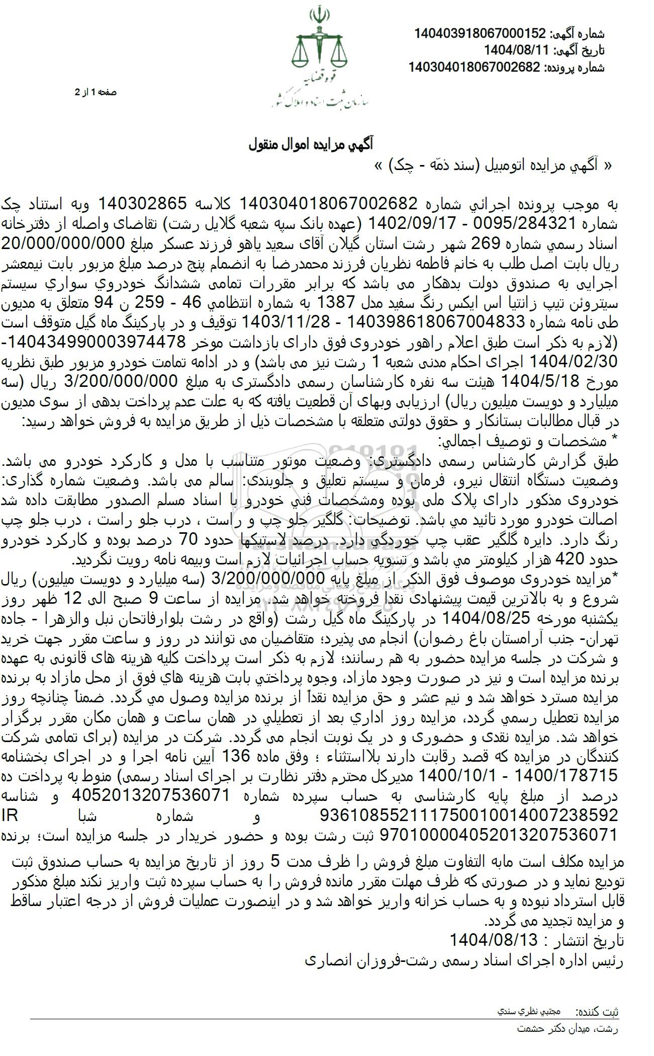 به موجب پرونده اجرائی شماره 140304018067002682 کلاسه 140302865 و به استناد چک شماره 0095/284321 - 1402.09.17 (عهده) بانک سپه شعبه گلایل رشت تقاضای واصله از دفترخانه اسناد رسمی شماره 269 شهر رشت استان گیلان آقای سعید یاهو فرزند عسکر مبلغ 20.000.000.000 ریال بابت اصل طلب به خانم فاطمه نظریان فرزند محمدرضا به انضمام پنج درصد مبلغ مزبور بابت نیمعشر اجرایی به صندوق دولت بدهکار میباشد که برابر مقررات تمامی ششدانگ خودروی سواری سیستم سیتروئن تیپ زانتیا اس ایکس رنگ سفید مدل 1387 به شماره انتظامی 46 - 259 ن 94 متعلق به مدیون طی نامه شماره 140398618067004833 - 1403.11.28 توقیف و در پارکینگ ماه گیل متوقف است. لازم به ذکر است طبق اعلام راهور خودروی فوق دارای بازداشت موخر 140434990003974478 1404.02.30 اجرای احکام مدنی شعبه 1 رشت نیز می باشد و در ادامه تمامت خودرو مزبور طبق نظریه مورخ 1404.5.18 هیئت سه نفره کارشناسان رسمی دادگستری به مبلغ 3.200.000.000 ریال (سه میلیارد و دویست میلیون ریال ارزیابی و بهای آن قطعیت یافته که به علت عدم پرداخت بدهی از سوی مدیون در قبال مطالبات بستانکار و حقوق دولتی متعلقه با مشخصات ذیل از طریق مزایده به فروش خواهد رسید. مشخصات و توصیف اجمالی