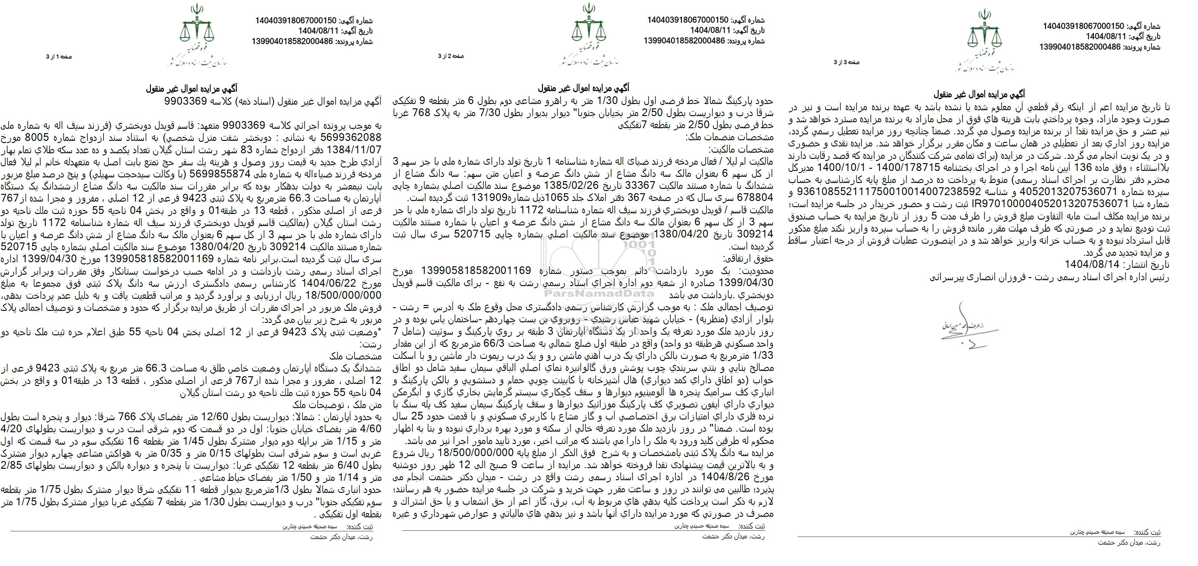 به موجب پرونده اجرائي کلاسه 9903369 متعهد قاسم قویدل دو بخشري فرزند سيف اله به شماره ملی 5699362088 به نشانی : دو بخشر شفت منزل شخصی به استناد سند ازدواج شماره 8005 مورخ 1384.11.07 دفتر ازدواج شماره 83 شهر رشت استان گیلان تعداد یکصد و ده عدد سکه طلاي تمام بهار آزادي طرح جدید به قیمت روز وصول و هزینه يك سفر حج تمتع بابت اصل به متعهدله خانم ام ليلا فعال مردخه فرزند ضیاءاله به شماره ملی 5699855874 (با وکالت سید حجت سهیلی) و پنج درصد مبلغ مزبور بابت نیمعشر به دولت بدهکار بوده که برابر مقررات سند مالکیت سه دانگ مشاع از ششدانگ یک دستگاه آپارتمان به مساحت 66.3 متر مربع به پلاک ثبتی 9423 فرعی از 12 اصلی ، مفروز و مجزا شده از 767 فرعی از اصلی مذکور ، قطعه 13 در طبقه 01 و واقع در بخش 04 ناحيه 55 حوزه ثبت ملك ناحيه دو رشت استان گیلان (بمالکیت قاسم قویدل دو بخشري فرزند سیف اله شماره شناسنامه 1172 تاریخ تولد دارای شماره ملی با جز سهم 3 از کل سهم 6 بعنوان مالک سه دانگ مشاع از شش دانگ عرصه و اعیان با شماره مستند مالکیت 309214 تاریخ 1380.04.20 موضوع سند مالكيت اصلي بشماره چاپی 520715 سری سال ثبت گردیده است. برابر نامه شماره 139905818582001169 مورخ 1399.04.30 اداره اجرای اسناد رسمی رشت بازداشت و در ادامه حسب درخواست بستانکار وفق مقررات و برابر گزارش مورخ 1404.06.22 کارشناس رسمی دادگستری ارزش سه دانگ پلاک ثبتی فوق مجموعا به مبلغ 18.500.000.000 ریال ارزیابی و برآورد گردید و مراتب قطعیت یافت و به دلیل عدم پرداخت بدهی فروش ملک مزبور در اجرای مقررات از طریق مزایده برگزار که حدود و مشخصات و توصیف اجمالی پلاک مزبور به شرح زیر بیان می گردد.