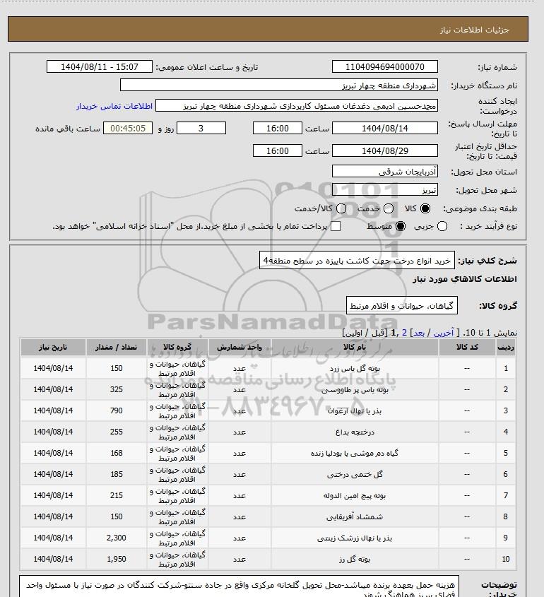 تلفن:5- 88349670 (021) فکس: 88349673 (021) Website: www.ParsNamadData.com E-mail: Info@ParsNamadData.com استعلام خرید انواع درخت جهت کاشت پاییزه در سطح منطقه4
