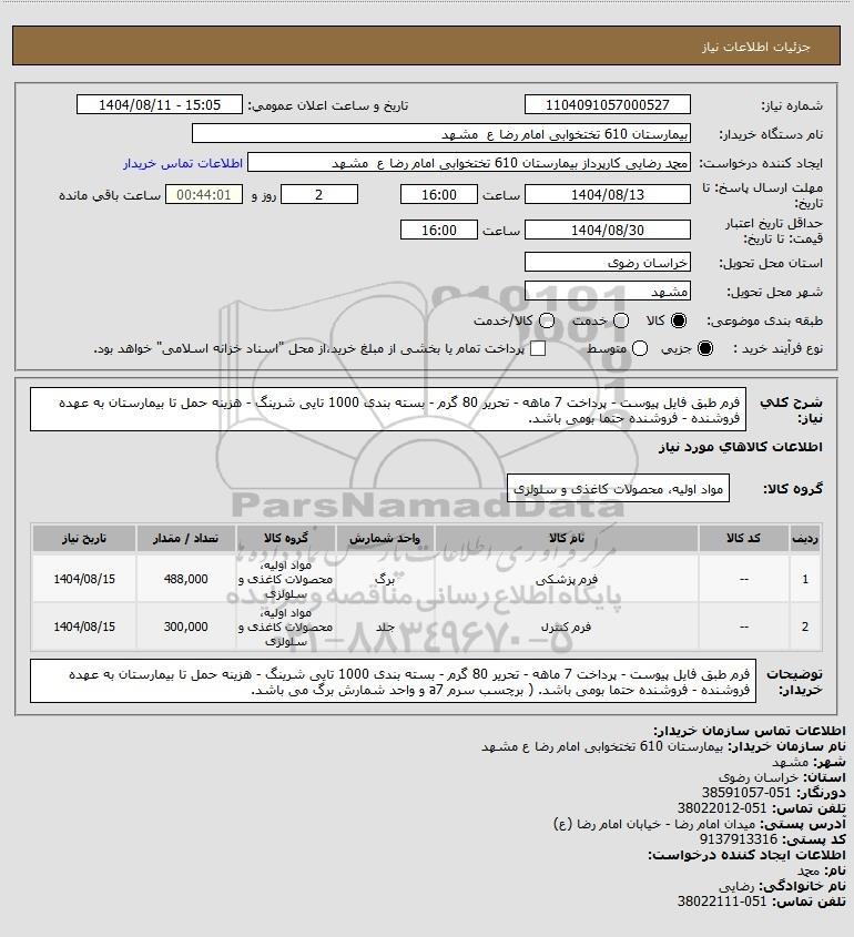 تلفن:5- 88349670 (021) فکس: 88349673 (021) Website: www.ParsNamadData.com E-mail: Info@ParsNamadData.com استعلام فرم طبق فایل پیوست - پرداخت 7 ماهه - تحریر 80 گرم - بسته بندی 1000 تایی شرینگ - هزینه حمل تا بیمارستان به عهده فروشنده - فروشنده حتما بومی باشد.