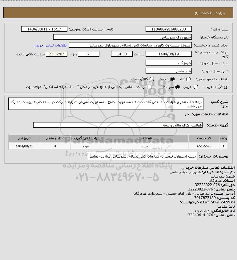 تلفن:5- 88349670 (021) فکس: 88349673 (021) Website: www.ParsNamadData.com E-mail: Info@ParsNamadData.com استعلام بیمه های عمر و حوادث شخص ثالث بدنه مسئولیت جامع مسئولیت آموزش شرایط شرکت در استعلام به پیوست مدارک می باشد