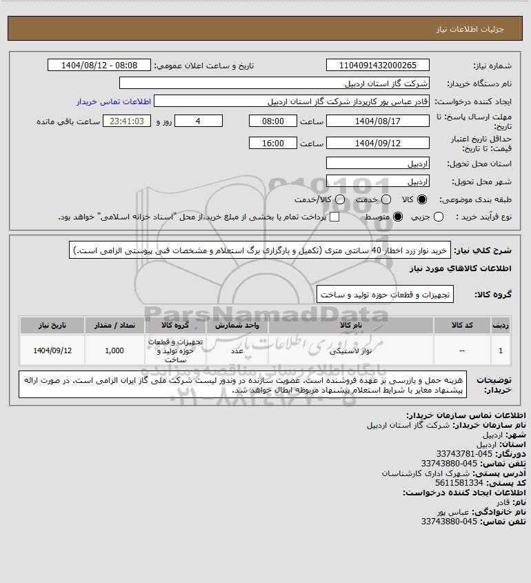 تلفن:5- 88349670 (021) فکس: 88349673 (021) Website: www.ParsNamadData.com E-mail: Info@ParsNamadData.com استعلام خرید نوار زرد اخطار 40 سانتی متری (تکمیل و بارگزاری برگ استعلام و مشخصات فنی پیوستی الزامی است.)