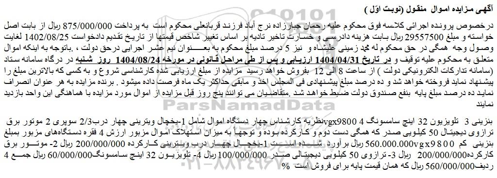 درخصوص پرونده اجرائی کلاسه فوق محکوم علیه رحمان جبارزاده نرج آباد فرزند قربانعلی محکوم است به پرداخت 875/000/000 ریال از بابت اصل خواسته و مبلغ 29557500 ریال بابت هزینه دادرسی و خسارت تاخیر تادیه بر اساس تغییر شاخص قیمتها از تاریخ تقدیم دادخواست 1402/08/25 لغایت وصول وجه همگی در حق محکوم له محمد زمینی علیشاه و نیز 5 درصد مبلغ محکوم به بعــــــنوان نیم عشر اجرایی درحق دولت ، .باتوجه به اینکه اموال متعلق به محکوم علیه توقیف و در تاریخ 1404/04/31 ارزیابی و پس از طی مراحل قانونی در مورخه 1404/08/24 روز شنبه در درگاه سامانه ستاد (سامانه تدارکات الکترونیکی دولت ) از ساعت 8 الی 12 بفروش خواهد رسید مزایده از مبلغ ارزیابی شده کارشناسی شروع و به کسی که بالاترین مبلغ را پیشنهاد نماید فروخته خواهد شد و ده درصد مبلغ پیشنهادی فی المجلس اخذ و مابقی حداکثر یک ماه فرصت داده میشود . برنده مزایده به هر عنوان انصراف نماید ده درصد مبلغ پایه بنفع صندوق دولت ضبط خواهد شد .متقاضیان می توانند پنج روز قبل مزایده از اموال مورد مزایده با هماهنگی این واحد بازدید نمایند