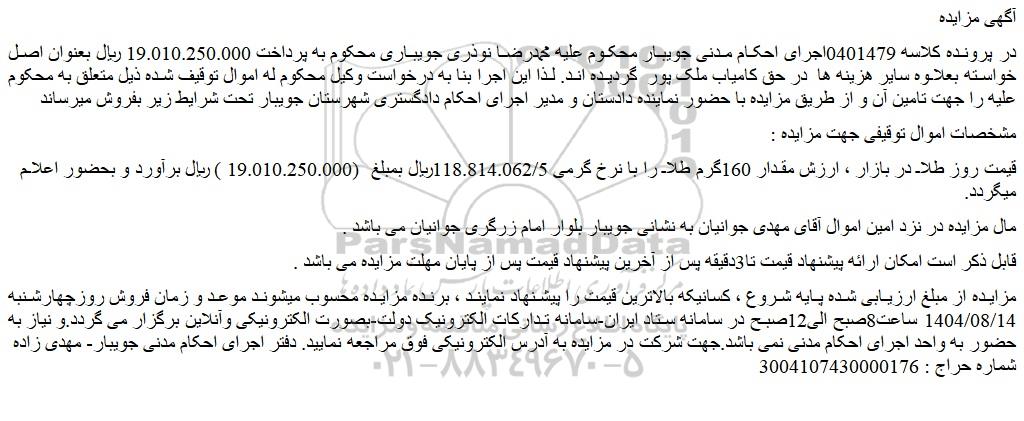 تلفن:5- 88349670 (021) فکس: 88349673 (021) Website: www.ParsNamadData.com E-mail: Info@ParsNamadData.com مزایده مقدار 160گرم طلا