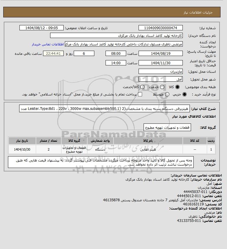 تلفن:5- 88349670 (021) فکس: 88349673 (021) Website: www.ParsNamadData.com E-mail: Info@ParsNamadData.com استعلام هیتربرقی دستگاه بسته بندی با مشخصات(LeisterType:8d1 220v 3000w max.subassembly500.1) 2 عدد