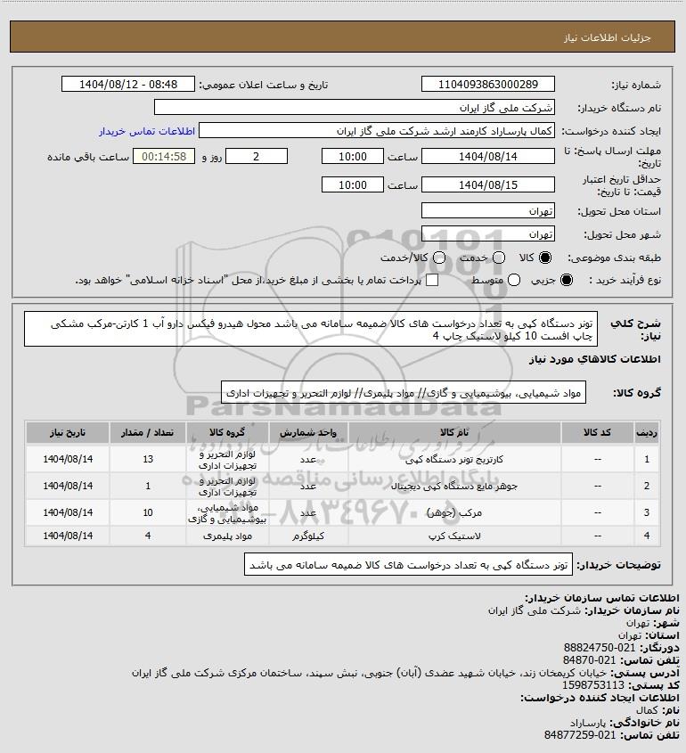 تلفن:5- 88349670 (021) فکس: 88349673 (021) Website: www.ParsNamadData.com E-mail: Info@ParsNamadData.com استعلام تونر دستگاه کپی به تعداد درخواست های کالا ضمیمه سامانه می باشد محول هیدرو فیکس دارو آب 1 کارتن-مرکب مشکی چاپ افست 10 کیلو لاستیک چاپ 4
