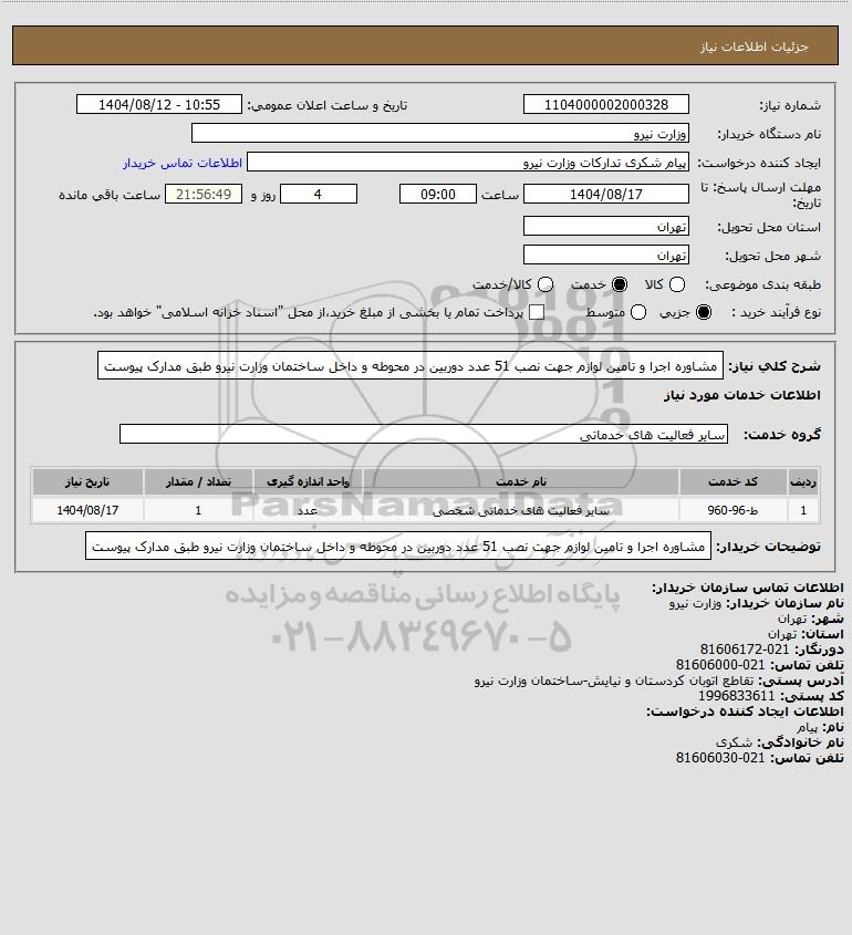 تلفن:5- 88349670 (021) فکس: 88349673 (021) Website: www.ParsNamadData.com E-mail: Info@ParsNamadData.com استعلام مشاوره اجرا و تامین لوازم جهت نصب 51 عدد دوربین در محوطه و داخل ساختمان وزارت نیرو طبق مدارک پیوست