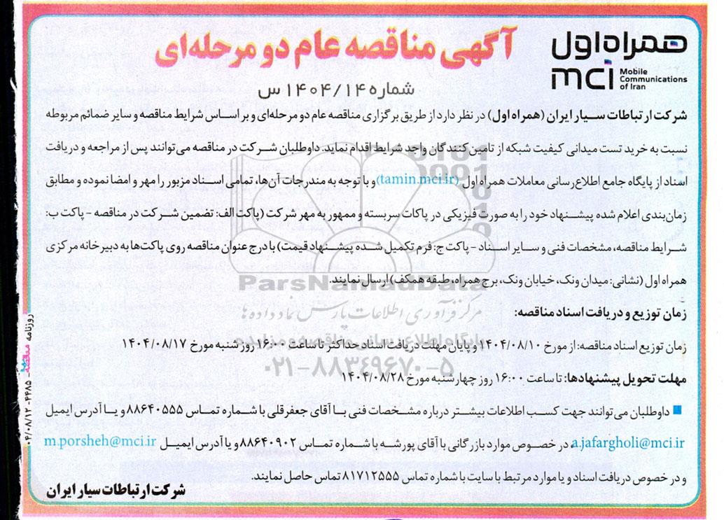 شرکت ارتباطات سیار ایران (همراه اول) در نظر دارد از طریق برگزاری مناقصه عام دو مرحلهای و بر اساس شرایط مناقصه و سایر ضمائم مربوطه نسبت به خرید تست میدانی کیفیت شبکه از تامینکنندگان واجد شرایط اقدام نماید. داوطلبان شرکت در مناقصه میتوانند پس از مراجعه و دریافت اسناد از پایگاه جامع اطلاعرسانی معاملات همراه اول (tamin.mci.ir) و با توجه به مندرجات آنها، تمامی اسناد مزبور را مهر و امضا نموده و مطابق زمانبندی اعلام شده پیشنهاد خود را به صورت فیزیکی در پاکات سربسته و ممهور به مهر شرکت (پاکت الف: تضمین شرکت در مناقصه – پاکت ب: شرایط مناقصه، مشخصات فنی و سایر اسناد – پاکت ج: فرم تکمیل شده پیشنهاد قیمت) با درج عنوان مناقصه روی پاکتها به دبیرخانه مرکزی همراه اول (نشانی: میدان ونک، خیابان ونک، برج همراه، طبقه همکف) ارسال نمایند.