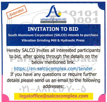 تلفن:5- 88349670 (021) فکس: 88349673 (021) Website: www.ParsNamadData.com E-mail: Info@ParsNamadData.com مناقصه Extended intends to purchase Vibration Grinding Mill & Hydraulic Press ...