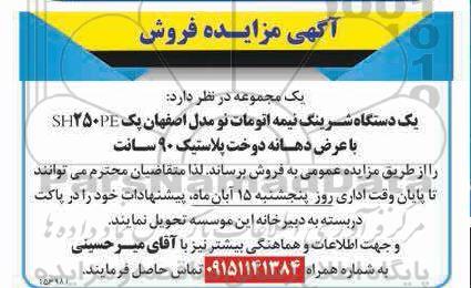 تلفن:5- 88349670 (021) فکس: 88349673 (021) Website: www.ParsNamadData.com E-mail: Info@ParsNamadData.com مزایده فروش یک دستگاه شرینگ نیمه اتومات نو مدل اصفهان پک SH250PE با عرض دهانه دوخت پلاستیک 90 سانت