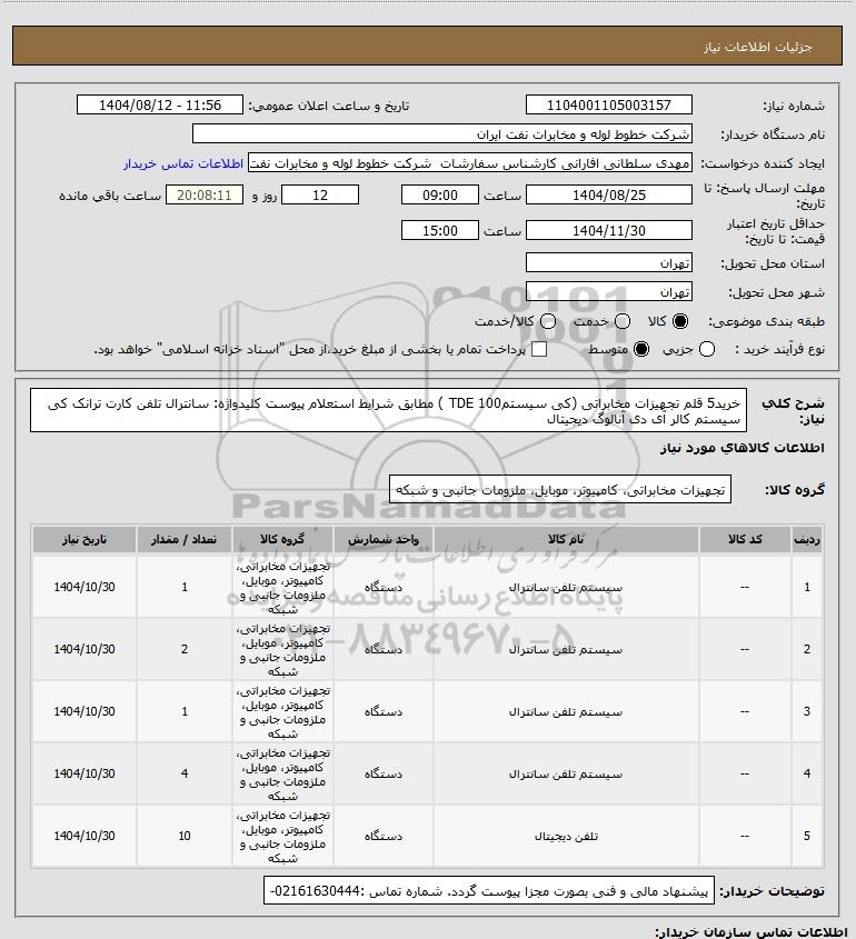 تلفن:5- 88349670 (021) فکس: 88349673 (021) Website: www.ParsNamadData.com E-mail: Info@ParsNamadData.com استعلام خرید5 قلم تجهیزات مخابراتی (کی سیستم100 TDE ) مطابق شرایط استعلام پیوست