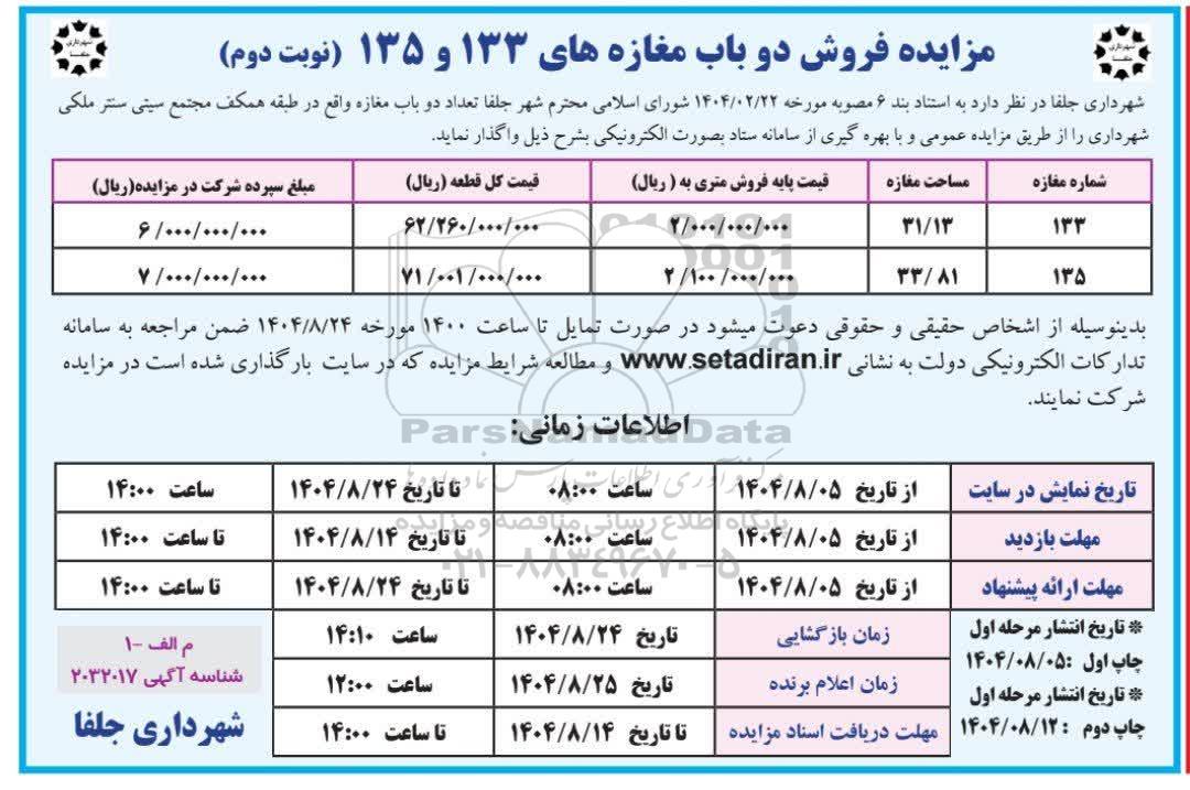 شهرداری جلفا در نظر دارد به استناد بند 6 مصوبه مورخه 1404.02.22 شورای اسلامی محترم شهر جلفا تعداد دو باب مغازه واقع در طبقه همکف مجتمع سیتی سنتر ملکی شهرداری را از طریق مزایده عمومی و با بهره گیری از سامانه ستاد بصورت الکترونیکی بشرح ذیل واگذار نماید.