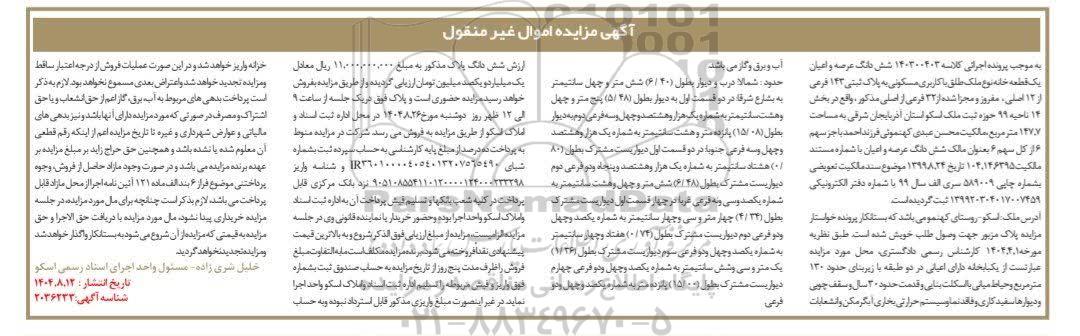 و شناسه مزایده حضوری است و پلاک فوق در یک جلسه از ساعت 9 الی 12 ظهر روز دوشنبه مورخ 1404.08.26 در محل اداره ثبت اسناد و املاک اسکو از طریق مزایده به فروش می رسد. شرکت در مزایده منوط به پرداخت ده درصد از مبلغ پایه کارشناسی به حساب سپرده ثبت بشماره شبای IR