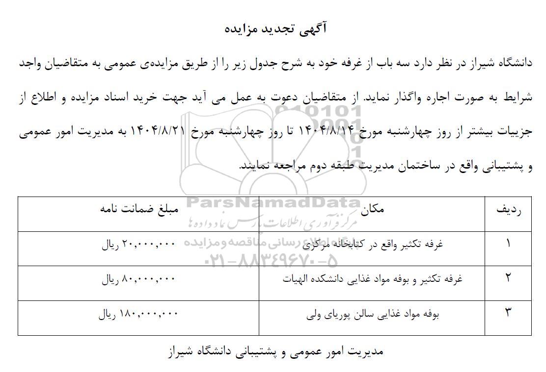تلفن:5- 88349670 (021) فکس: 88349673 (021) Website: www.ParsNamadData.com E-mail: Info@ParsNamadData.com تجدید مزایده اجاره سه باب از غرفه