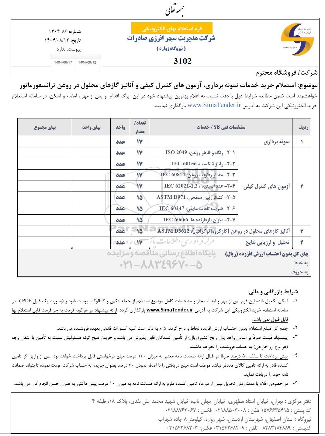 موضوع: استعلام خرید خدمات نمونه برداری ، ازمون های کنترل کیفی و آنالیز گازهای محلول در روغن ترانسفورماتور