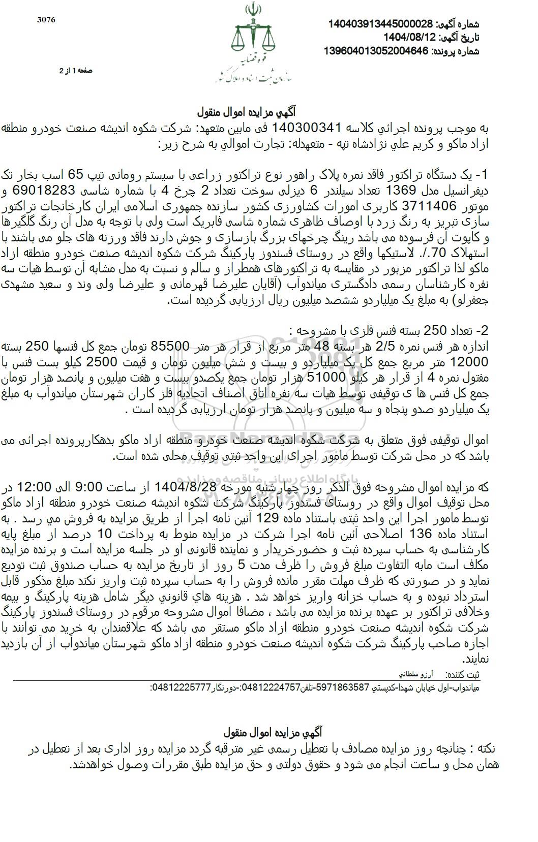 که مزایده اموال مشروحه فوق الذکر روز چهارشنبه مورخه 1404.8.28 از ساعت 9:00 الى 12:00 در محل توقیف اموال واقع در روستای فستدوز پارکینگ شرکت شکوه اندیشه صنعت خودرو منطقه آزاد ماکو توسط مامور اجرا این واحد ثبتی باستناد ماده 129 آئین نامه اجرا از طریق مزایده به فروش می رسد . به استناد ماده 136 اصلاحی آئین نامه اجرا شرکت در مزایده منوط به پرداخت 10 درصد از مبلغ پایه کارشناسی به حساب سپرده ثبت و حضور خریدار و نماینده قانونی او در جلسه مزایده است و برنده مزایده مکلف است ما به التفاوت مبلغ فروش را ظرف مدت 5 روز از تاریخ مزایده به حساب صندوق ثبت تودیع نماید و در صورتی که ظرف مهلت مقرر مانده فروش را به حساب سپرده ثبت واریز نکند مبلغ مذکور قابل استرداد نبوده و به حساب خزانه واریز خواهد شد. هزینه های قانونی دیگر شامل هزینه پارکینگ و بیمه و خلافی تراکتور بر عهده برنده مزایده میباشد ، مضافا اموال مشروحه مرقوم در روستای فسندوز پارکینگ شرکت شکوه اندیشه صنعت خودرو منطقه آزاد ماکو مستقر میباشد که علاقمندان به خرید می توانند با اجازه صاحب پارکینگ شرکت شکوه اندیشه صنعت خودرو منطقه آزاد ماکو شهرستان میاندوآب از آن بازدید نمایند.