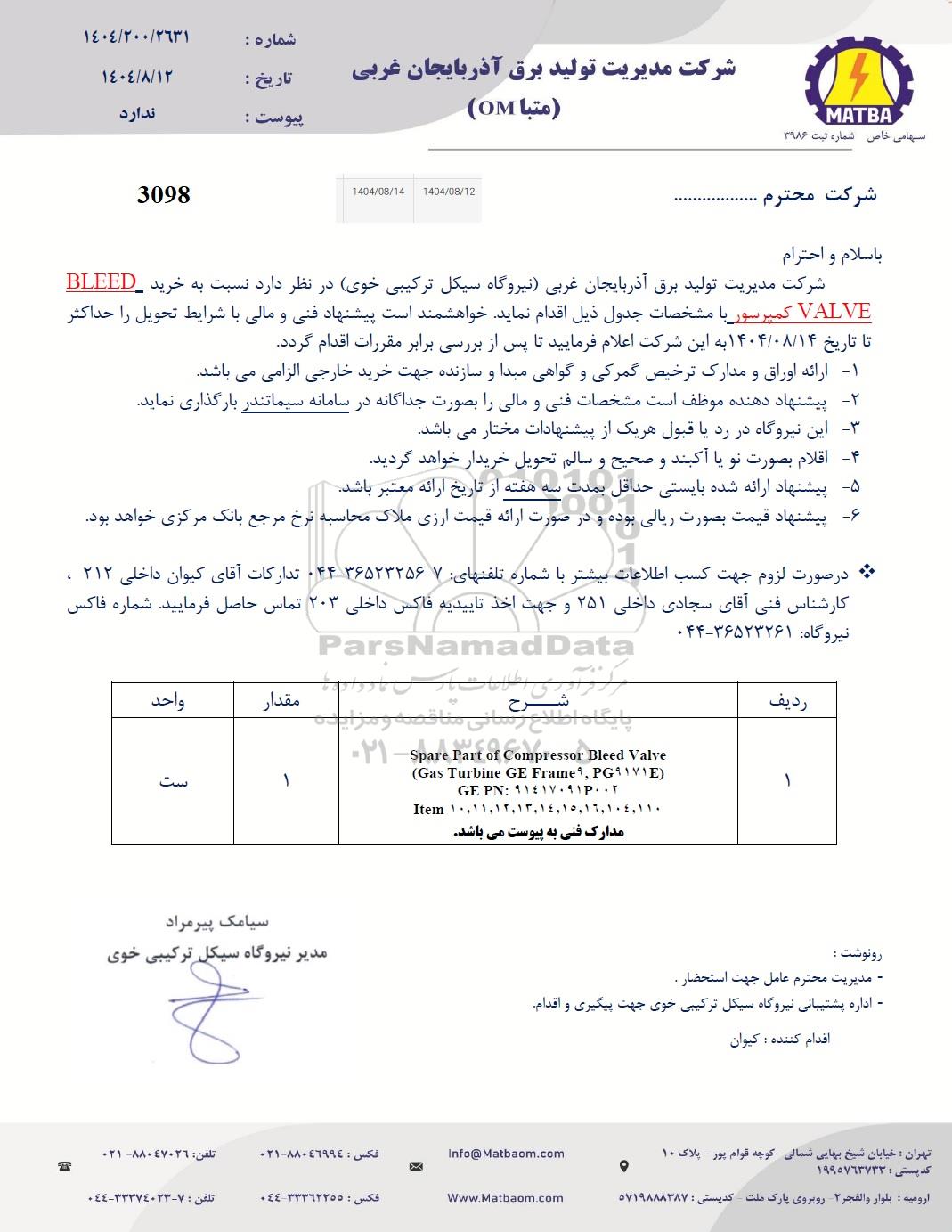 شرکت مدیریت تولید برق آذربایجان غربی (نیروگاه سیکل ترکیبی خوی) در نظر دارد نسبت به خرید BLEED VALVE کمپرسور با مشخصات جدول ذیل اقدام نماید خواهشمند است پیشنهاد فنی و مالی با شرایط تحویل را حداکثر تا تاریخ 1404.8.7 به این شرکت اعلام فرمایید تا پس از بررسی برابر مقررات اقدام گردد.