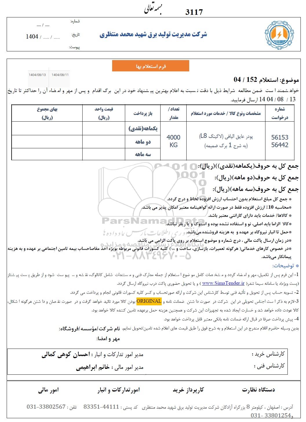 1- این فرم پس از تکمیل مهر و امضاء گردد و مشخصات کامل موضوع استعلام از جمله مدارک فنی و مستندات شامل کاتالوگ نقشه و .... پیوست شود و از طریق پست پیشتاز (پست ویژه) با سامانه سیما تندر ( www.SimaTender.ir ) و یا تحویل حضوری پاکت درب نیروگاه ارسال گردد.
