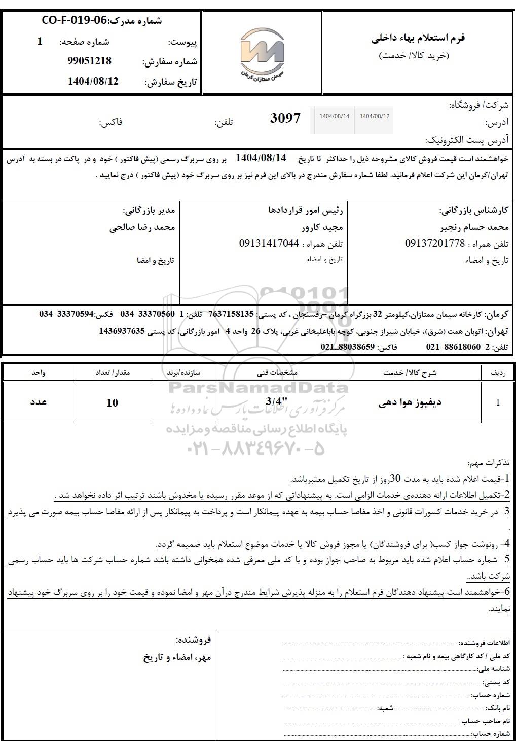 خواهشمند است قیمت فروش کالای مشروحه ذیل را حداکثر تا تاریخ 1404.08.14 بر روی سربرگ رسمی (پیش فاکتور) خود و در پاکت دربسته به ادرس تهران /کرمان این شرکت اعلام فرمائید. لطفا شماره سفارش مندرج در بالای این فرم نیز بر روی سربرگ خود (پیش فاکتور) درج نمایید.