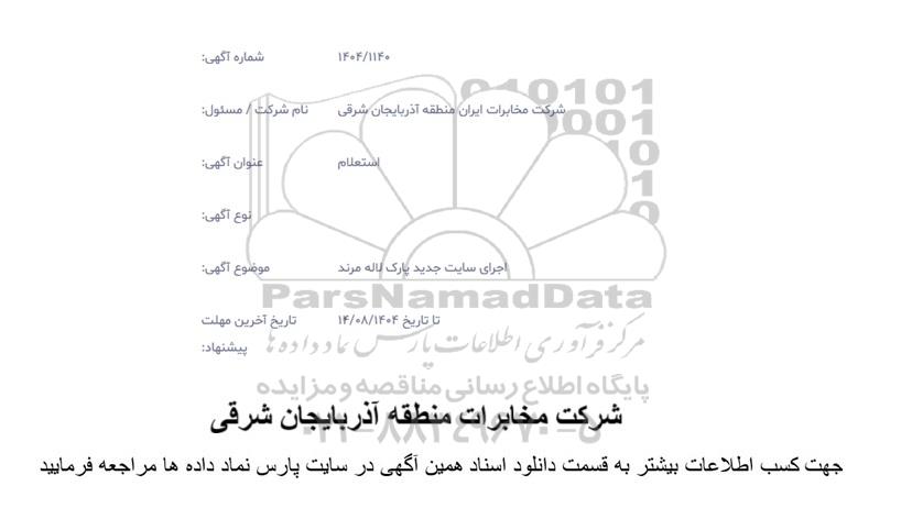 تلفن:5- 88349670 (021) فکس: 88349673 (021) Website: www.ParsNamadData.com E-mail: Info@ParsNamadData.com استعلام اجرای سایت جدید پارک لاله مرند
