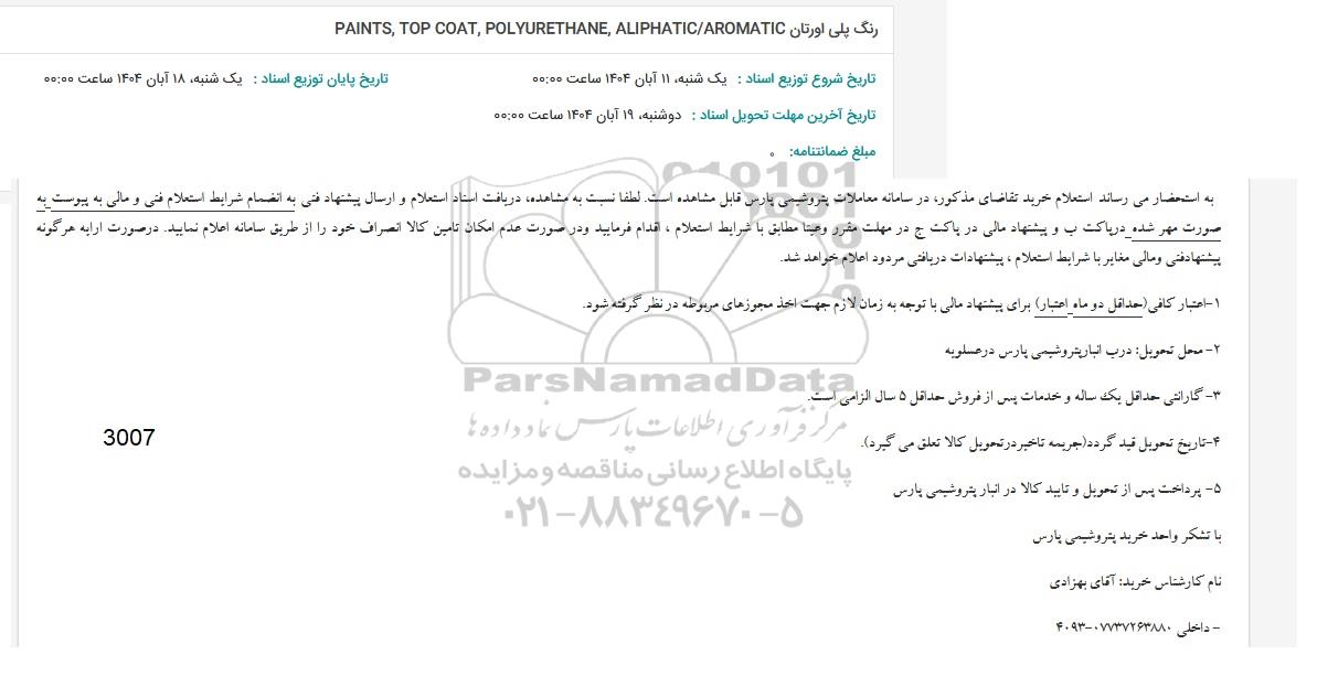 | عنوان آگهی: استعلام رنگ پلی اورتان PAINTS, TOP COAT, POLYURETHANE, ALIPHATIC/AROMATIC |