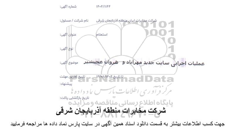 تلفن:5- 88349670 (021) فکس: 88349673 (021) Website: www.ParsNamadData.com E-mail: Info@ParsNamadData.com استعلام عملیات اجرایی سایت جدید مهرآباد و هروان عجبشیر