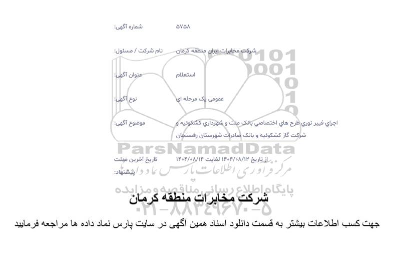 تلفن:5- 88349670 (021) فکس: 88349673 (021) Website: www.ParsNamadData.com E-mail: Info@ParsNamadData.com استعلام اجرای فیبرنوری طرحهای اختصاصی بانک ملت