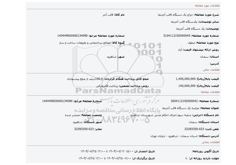 | عنوان آگهی: مزایده یک دستگاه قالب آجرنما |