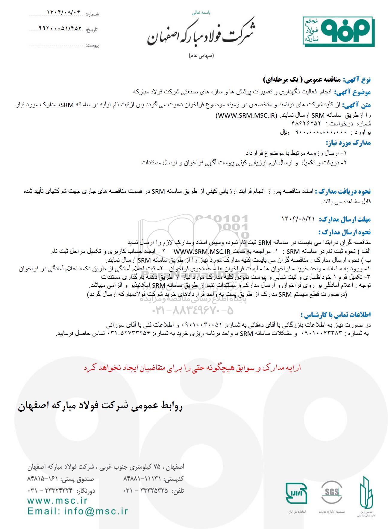 موضوع آگهی: انجام فعالیت نگهداری و تعمیرات پوشش ها و سازه های صنعتی شرکت فولاد مبارکه