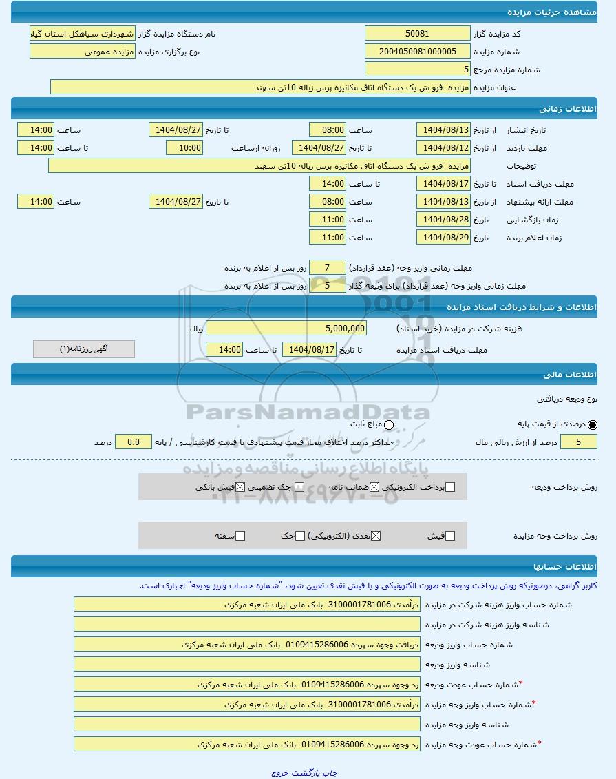 اطلاعات زمانی| تاریخ انتشار از تاریخ | 1404/08/13 | ساعت | 08:00 | تا تاریخ | 1404/08/27 | ساعت | 14:00 | | مهلت بازدید از | 1404/08/12 | تا تاریخ | 1404/08/27 | روزانه از ساعت | 10:00 | تا ساعت | 14:00 | | توضیحات | مزایده فرو ش یک دستگاه اتاق مکانیزه پرس زباله 10تن سهند | | مهلت ارائه پیشنهاد از تاریخ | 1404/08/13 | ساعت | 08:00 | تا تاریخ | 1404/08/27 | ساعت | 14:00 | | زمان بازگشایی تاریخ | 1404/08/28 | ساعت | 11:00 | | زمان اعلام برنده تاریخ | 1404/08/29 | ساعت | 11:00 | | مهلت زمانی واریز وجه (عقد قرارداد) 7 روز پس از اعلام به برنده | | مهلت زمانی واریز وجه (عقد قرارداد) برای وثیقه گذار 5 روز پس از اعلام به برنده |