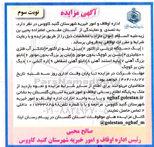 اداره اوقاف و امور خیریه شهرستان گنبد کاووس در نظر دارد. به تصدی و نمایندگی از آستان مقدس امامزاده یحیی بن زيد عليه السلام اموال مازاد با مشخصات ذیل را از طریق مزایده و با رعایت شرایط و مقررات اوقافی به فروش برساند