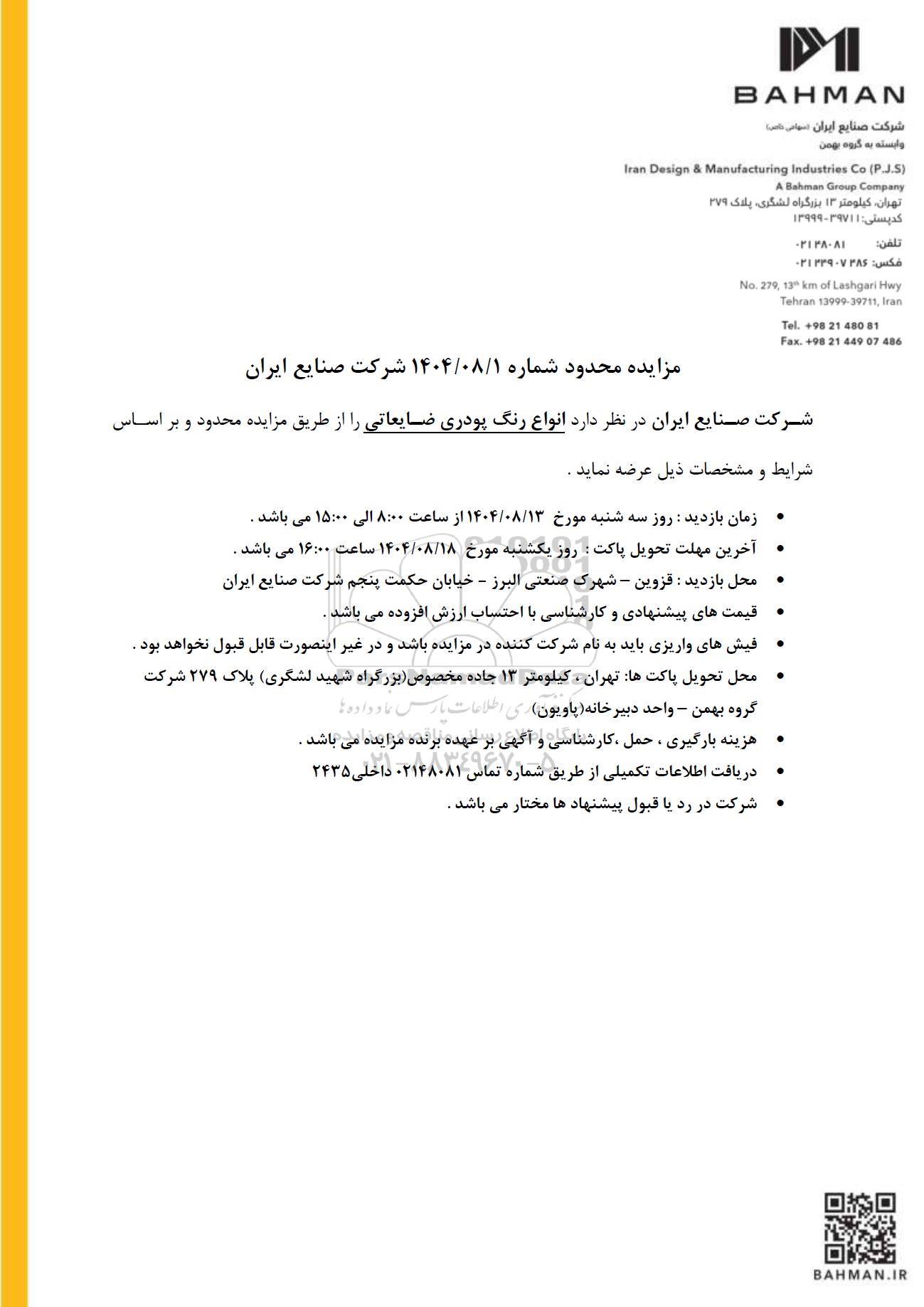 تلفن:5- 88349670 (021) فکس: 88349673 (021) Website: www.ParsNamadData.com E-mail: Info@ParsNamadData.com مزایده محدود انواع رنگ پودری ضایعاتی