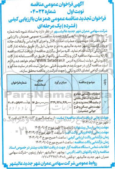 شرکت سهامی عمران شهر جدید عالیشهر در نظر دارد به استناد شیوه نامه شماره 162410/100/02 مورخ 98.11.5 به برگزاری تجدید مناقصه عمومی همزمان با ارزیابی کیفی (فشرده) جهت پروژه عملیات احداث کانال و اجرای لایه اساس و آسفالت جاده ورودی آرامستان شهر جدید عالیشهر به شرح جدول ذیل را از طریق سامانه تدارکات الکترونیکی دولت اقدام نماید. کلیه مراحل برگزاری مناقصه از دریافت اسناد مناقصه تا ارائه پیشنهاد مناقصه گران و بازگشایی پاکتها از طریق درگاه سامانه تدارکات الکترونیکی دولت ستاد به آدرس ستاد ایران انجام خواهد شد و لازم است مناقصه گران در صورت عدم عضویت قبلی مراحل ثبت نام در سایت مذکور و دریافت گواهی امضای الکترونیکی را جهت شرکت در مناقصه محقق سازند.