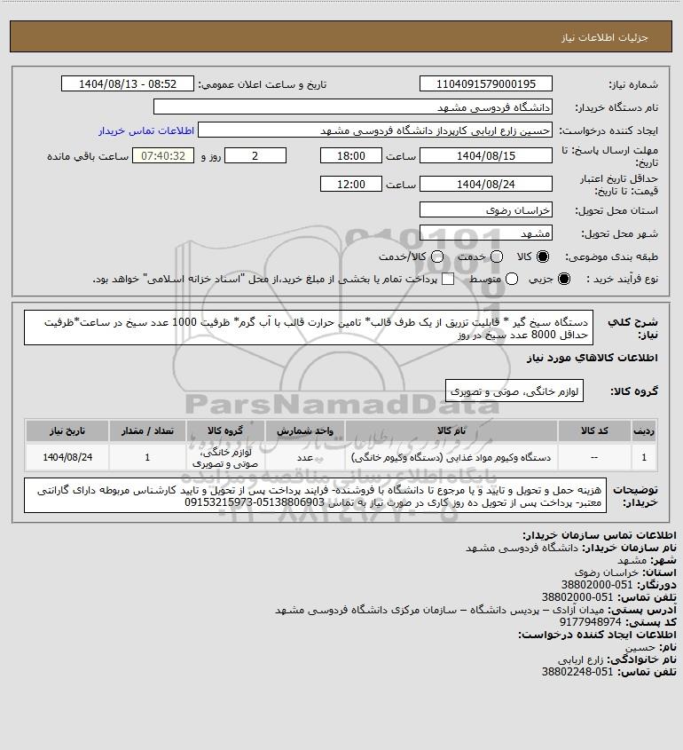 تلفن:5- 88349670 (021) فکس: 88349673 (021) Website: www.ParsNamadData.com E-mail: Info@ParsNamadData.com استعلام دستگاه سیخ گیر * قابلیت تزریق از یک طرف قالب* تامین حرارت قالب با آب گرم* ظرفیت 1000 عدد سیخ در ساعت*ظرفیت حداقل 8000 عدد سیخ در روز